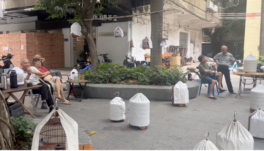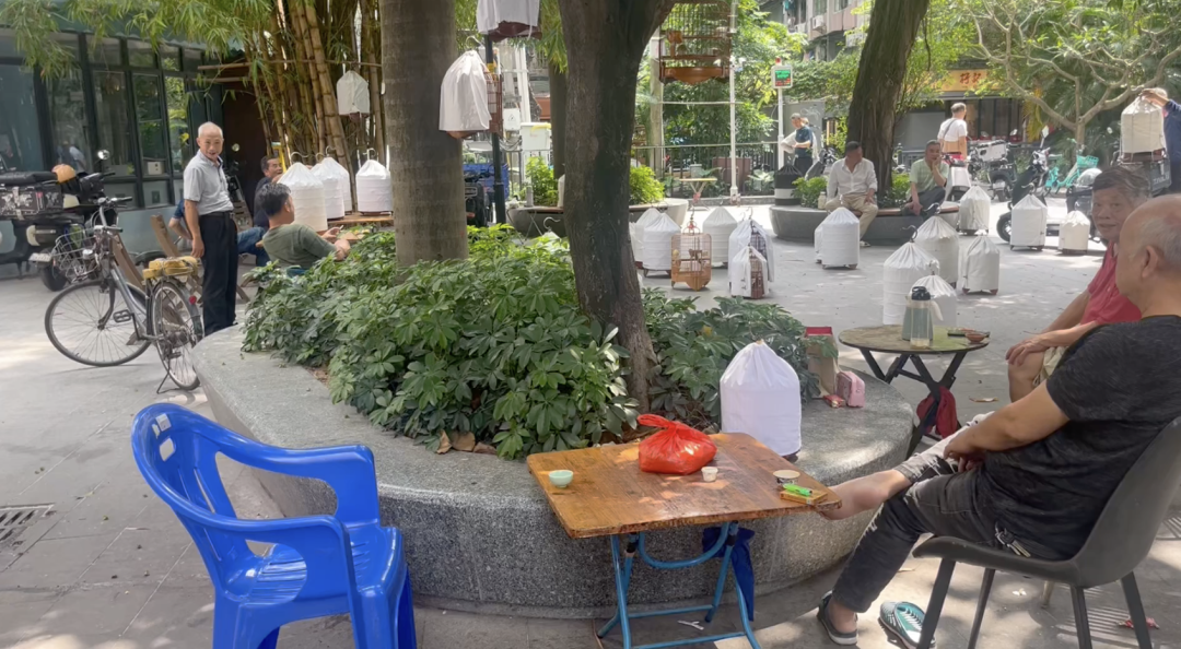 5月6日早上6点,记者来到海珠区紫金大街24号的小区休闲广场看到,已经有十多名老人提着鸟笼在这里遛鸟,他们一边遛鸟一边高声交谈,交流着养鸟心得。还有人坐在花坛边的椅子上抽烟,还有几位老人边喝茶边用手机播放视频。再加上鸟叫声不断,现场声音比较嘈杂。