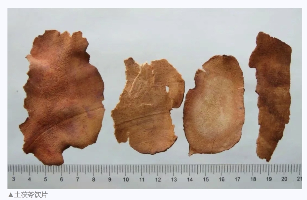 茯苓饮片常见为立方块状、或方块状厚片,呈白色、淡红色或淡棕色,质地坚实,嚼之粘牙。土茯苓呈长圆形或不规则的薄片,边缘不整齐,切面黄白色或红棕色,以水湿润后有黏滑感。二者饮片性状差距明显,非常容易区分。