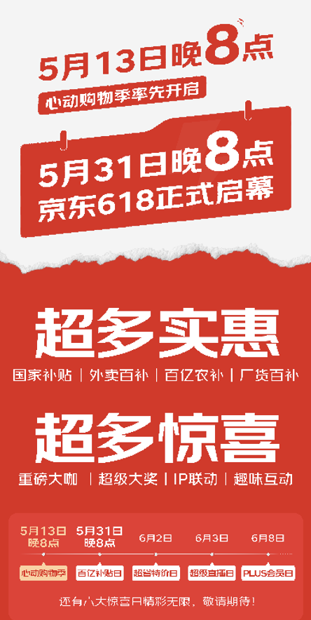具体来看,京东的心动购物季活动,将于5月13日20时开启,并一直持续至5月28日24时。而5月31日20时,京东“618”正式开启。