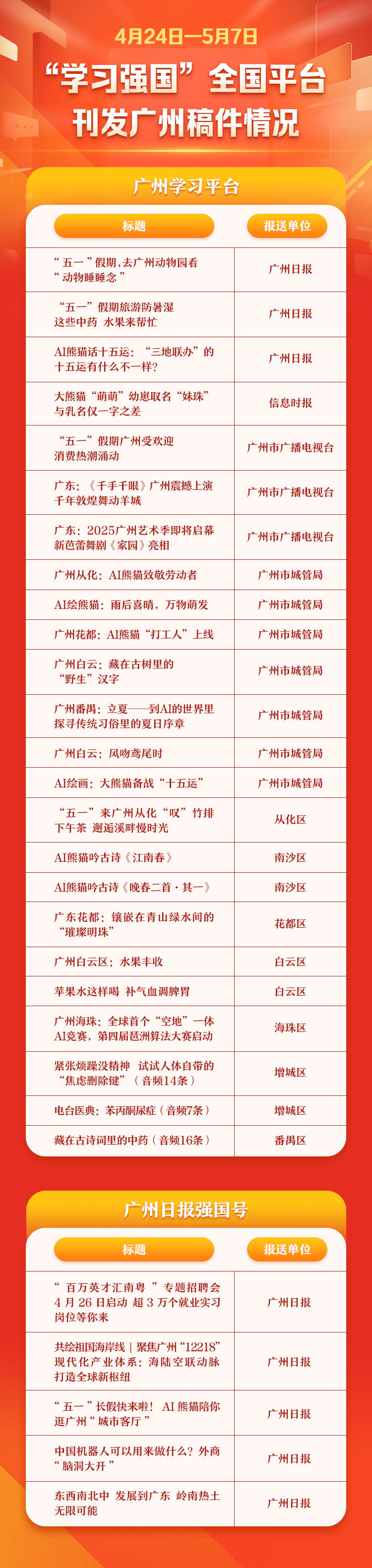 4月24日—5月7日“学习强国”全国平台刊发广州稿件情况