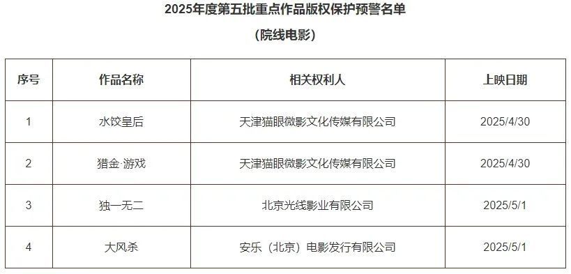 国家版权局近日发布2025年度第五批重点作品版权保护预警名单(院线电影)。《水饺皇后》《猎金·游戏》《独一无二》《大风杀》等院线电影上榜。