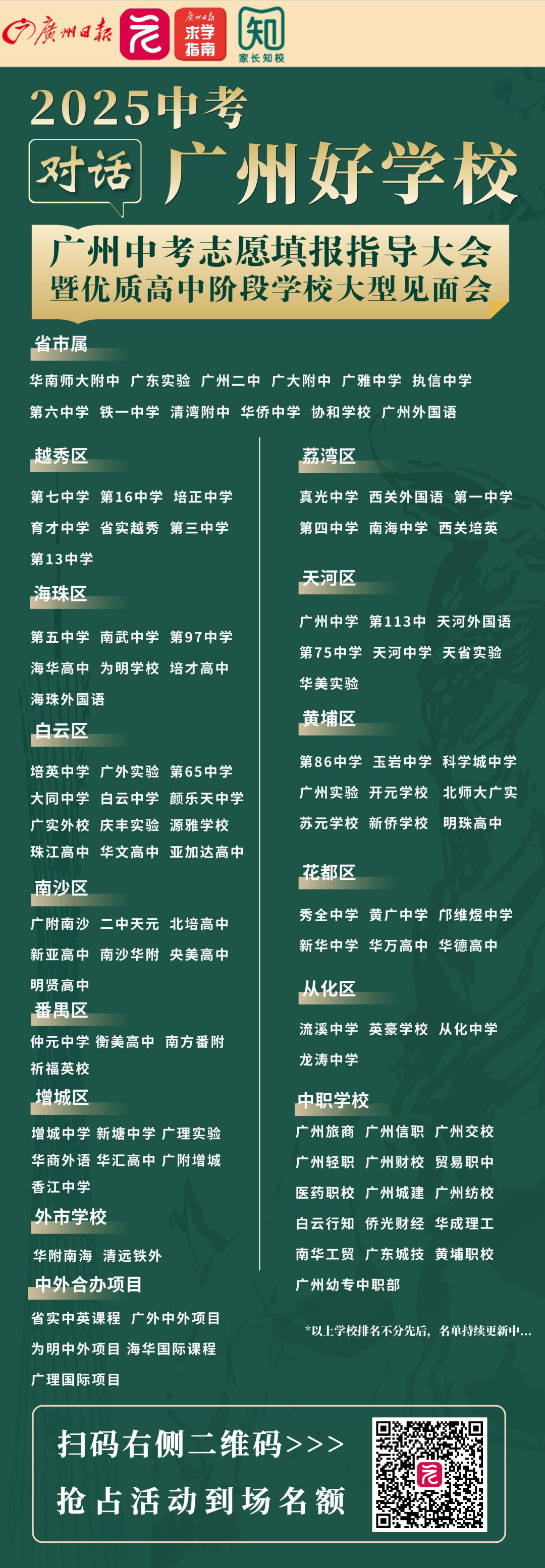 由广州日报报业集团(广州日报社)主办,广州日报社健康教育新闻部、广州广报文化发展有限公司承办,家长知校协办的2025年广州中考志愿填报指导大会暨优质高中阶段学校见面会将于5月18日上午8时至下午1时在广州东方宾馆举办。届时,100多所高中阶段学校招生负责人将提供面对面招生咨询,扫描二维码即可预约现场席位!