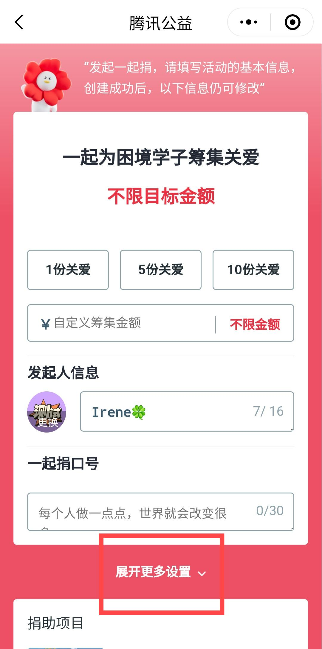 第二步:①点击“不限金额”;②编辑“发起人信息”,输入发起人名称,例如:2025年58广州市XXX(单位名);更换头像logo;③按需求设置“一起捐口号”;④点击“展开更多设置”。