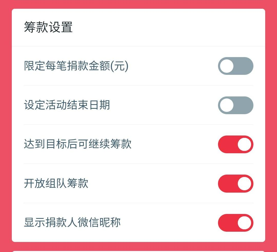 第三步:编辑“筹款设置”,勾选“达到目标后可继续筹款”“开发组队筹款”“显示捐款人微信昵称”三个选项。