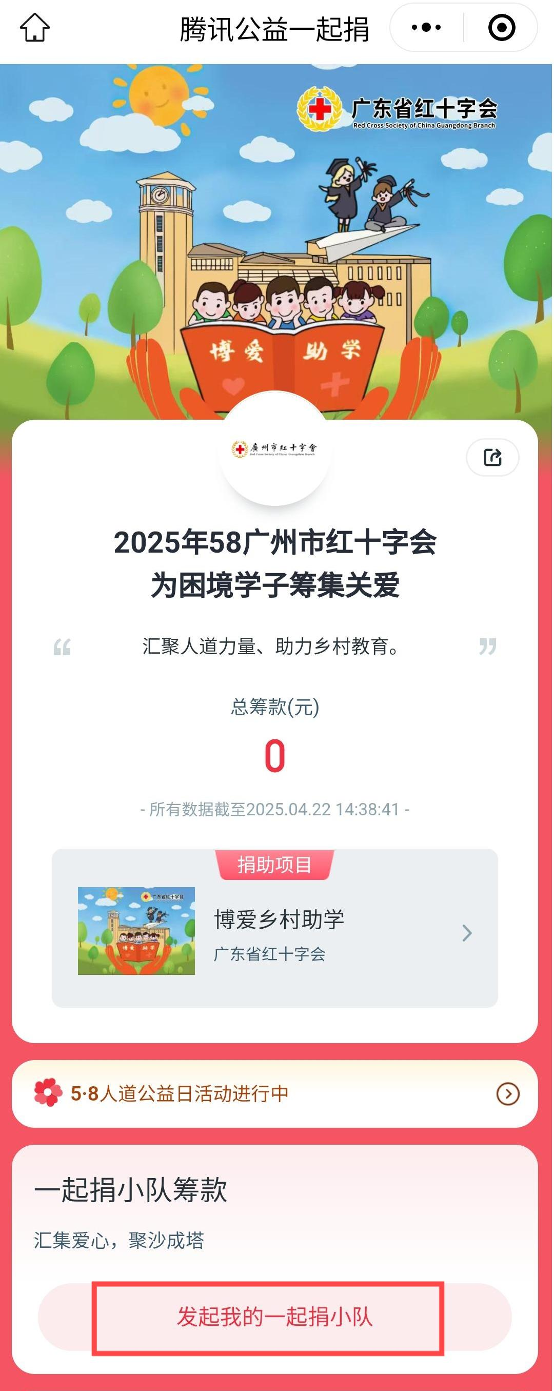 第一步:扫描对应的广州市红十字会项目二维码,进入界面,点击“发起我的一起捐小队”。