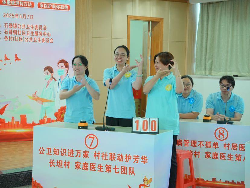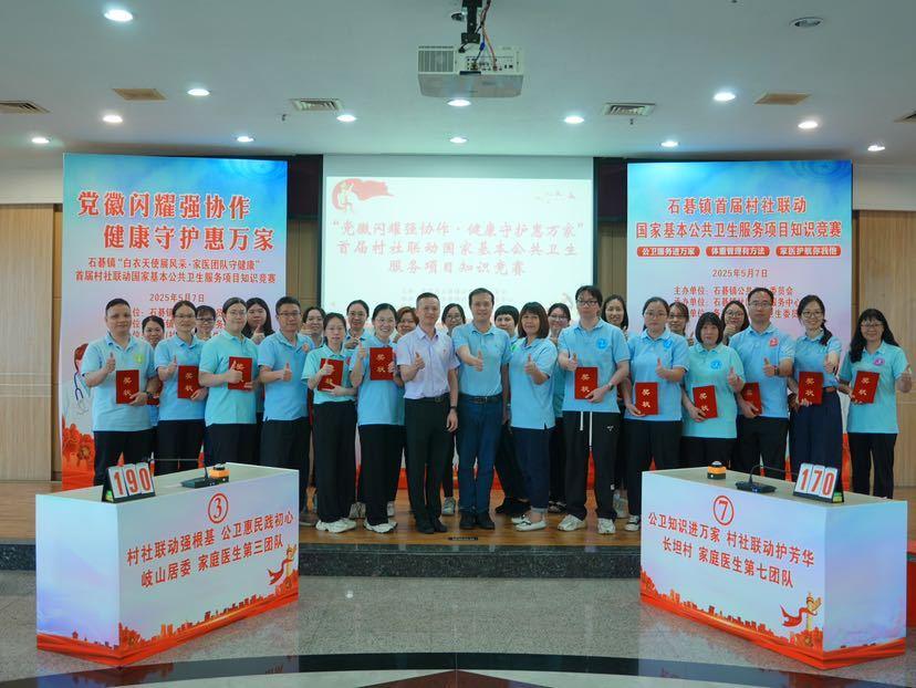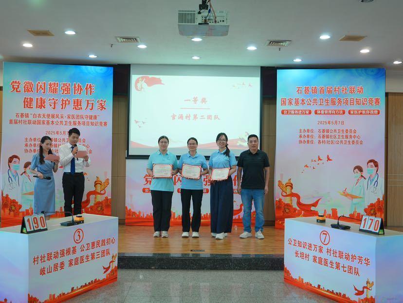 本次竞赛由石碁镇公共卫生委员会统筹指导、社区卫生服务中心主办,吸引全镇19个村(居)的公共卫生团队踊跃参与。经过4月25日线上初赛的激烈角逐,总分排名前8的队伍晋级决赛。决赛现场,参赛队员围绕慢病管理、体重管理、传染病防控等核心知识展开比拼,通过必答、抢答、风险题等环节,充分展现基层卫生队伍的专业素养与协作精神。最终,官涌村代表队凭借扎实的知识储备和默契配合斩获一等奖,成为基层公共卫生服务的标杆团队。