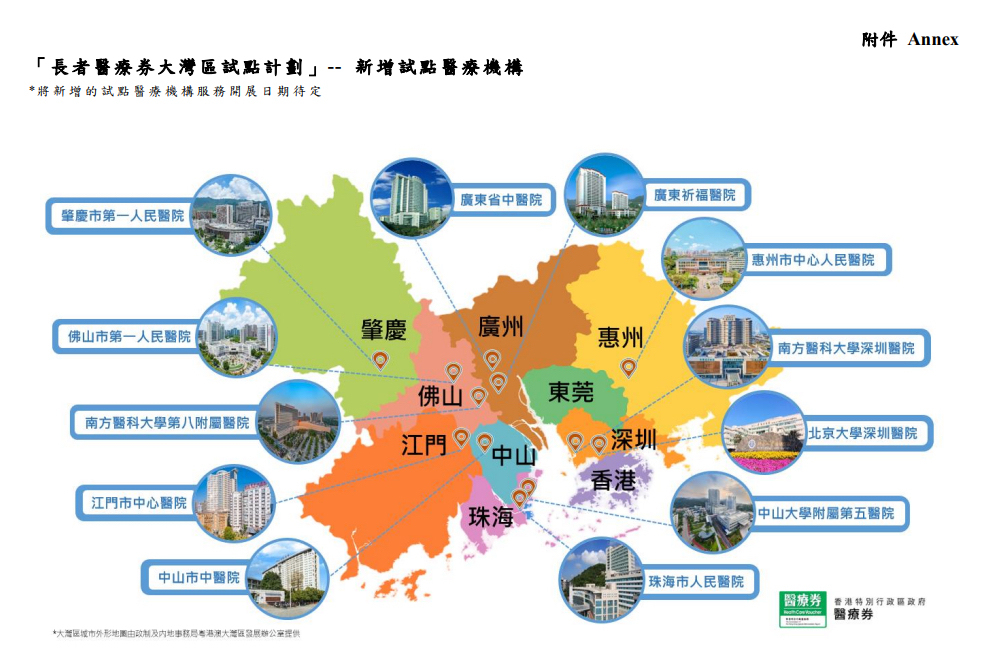 香港长者医疗券计划是香港特区政府2009年推出的一项便民政策,旨在通过财政激励,为65岁及以上长者提供私营基层医疗服务的选择,以辅助现有的公营医疗服务。该计划最初为试验性质,后于2015年起逐步扩展至粤港澳大湾区内地城市。“试点计划”医疗机构现有19家,连同香港大学深圳医院的一院两点,日后将有21个服务点可使用医疗券,让超过178万名合资格的香港长者受惠。