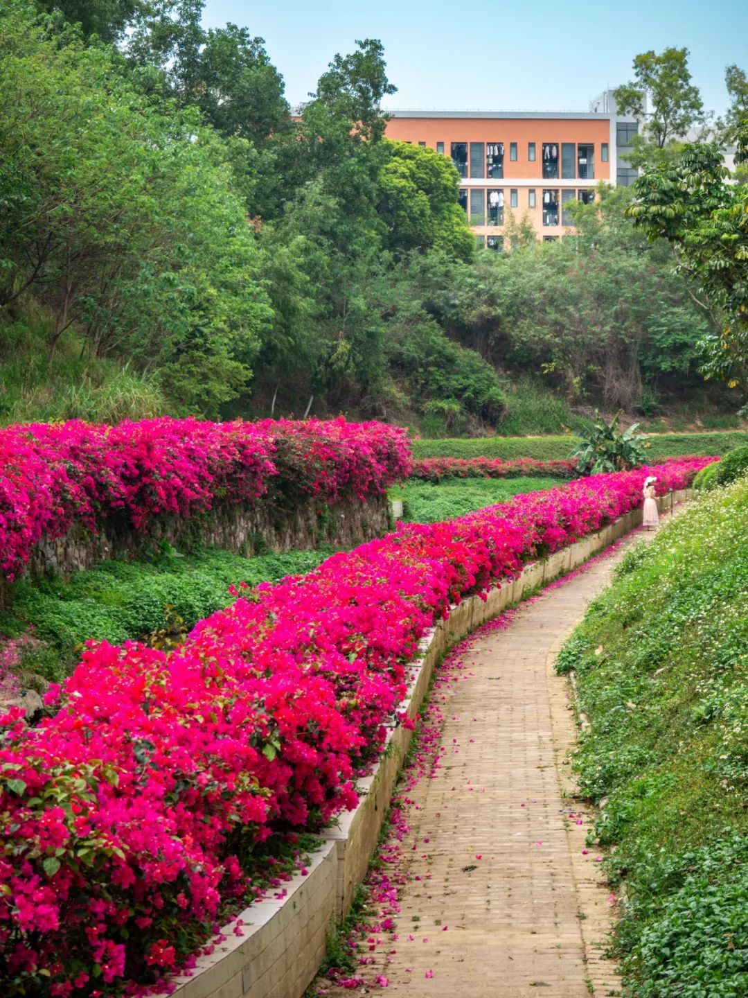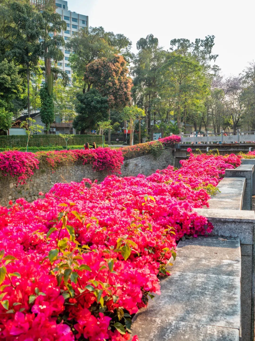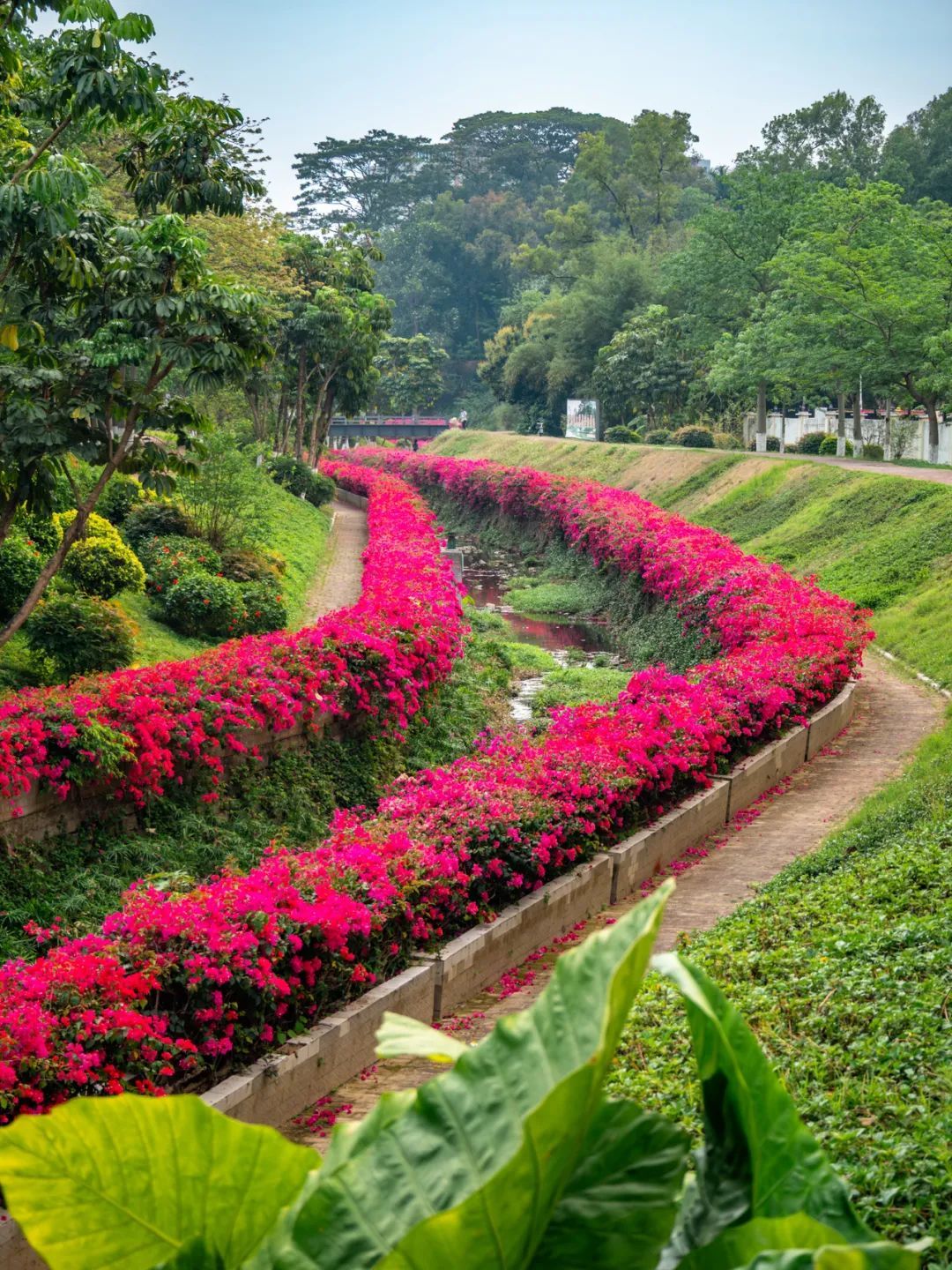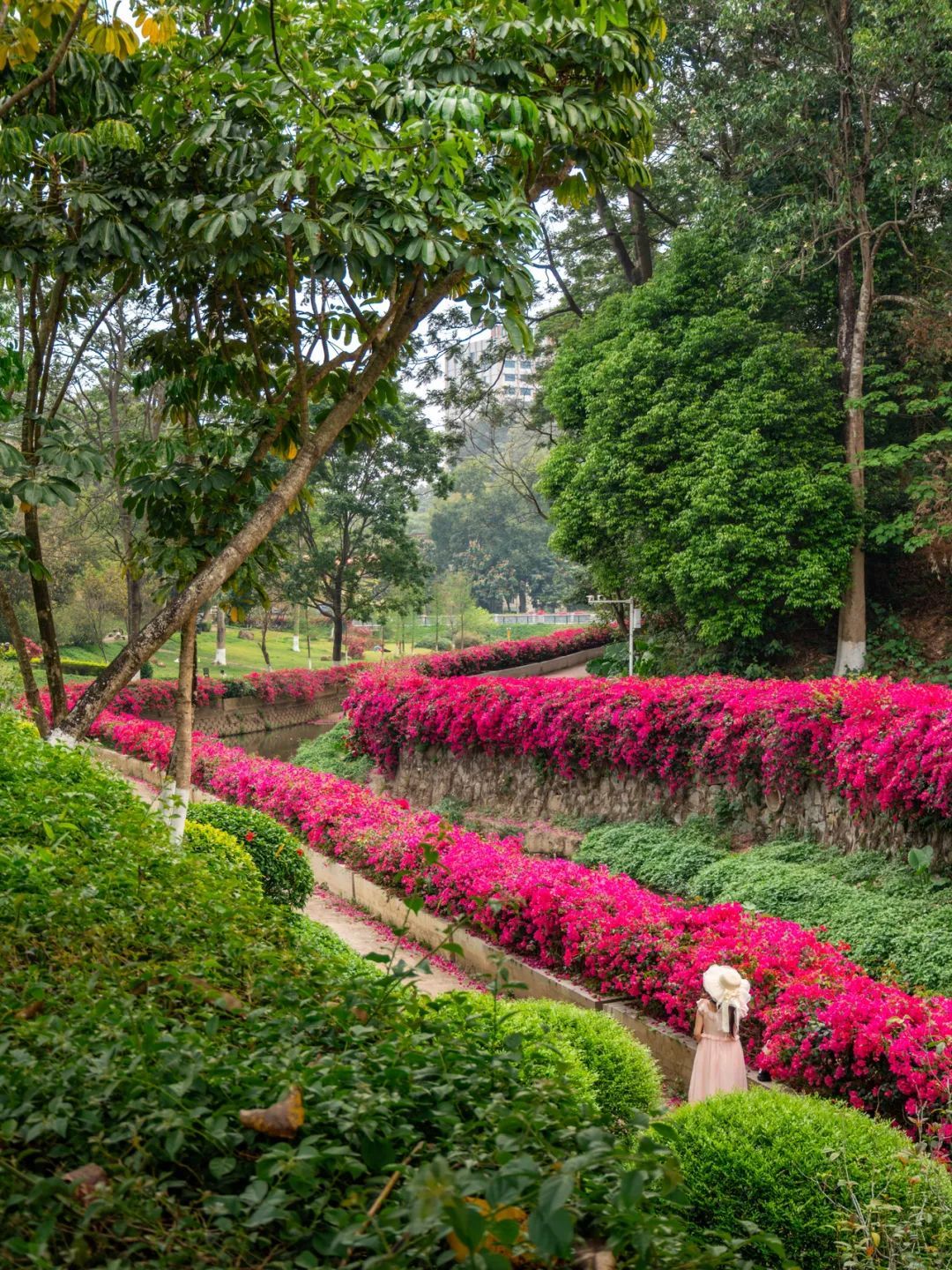 只见色调以粉、紫、红为主的簕杜鹃如瀑布般垂落,“花瀑”蜿蜒数百米,岸边是步道,高大苍翠的乔木将步道荫蔽。