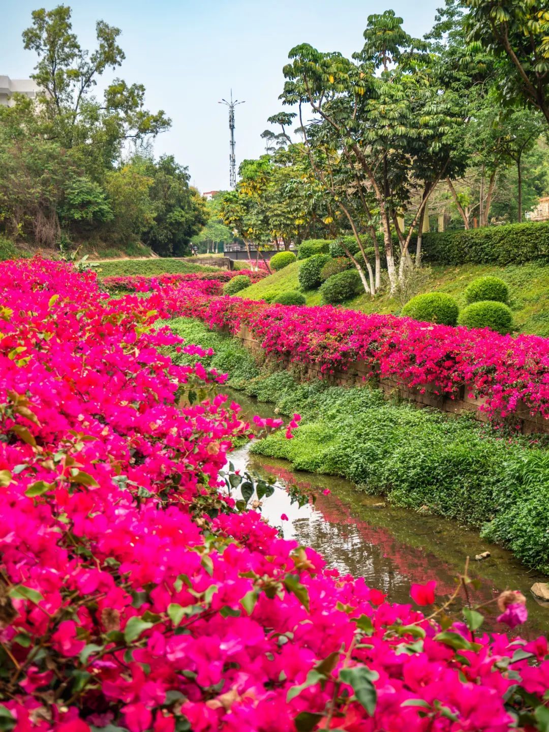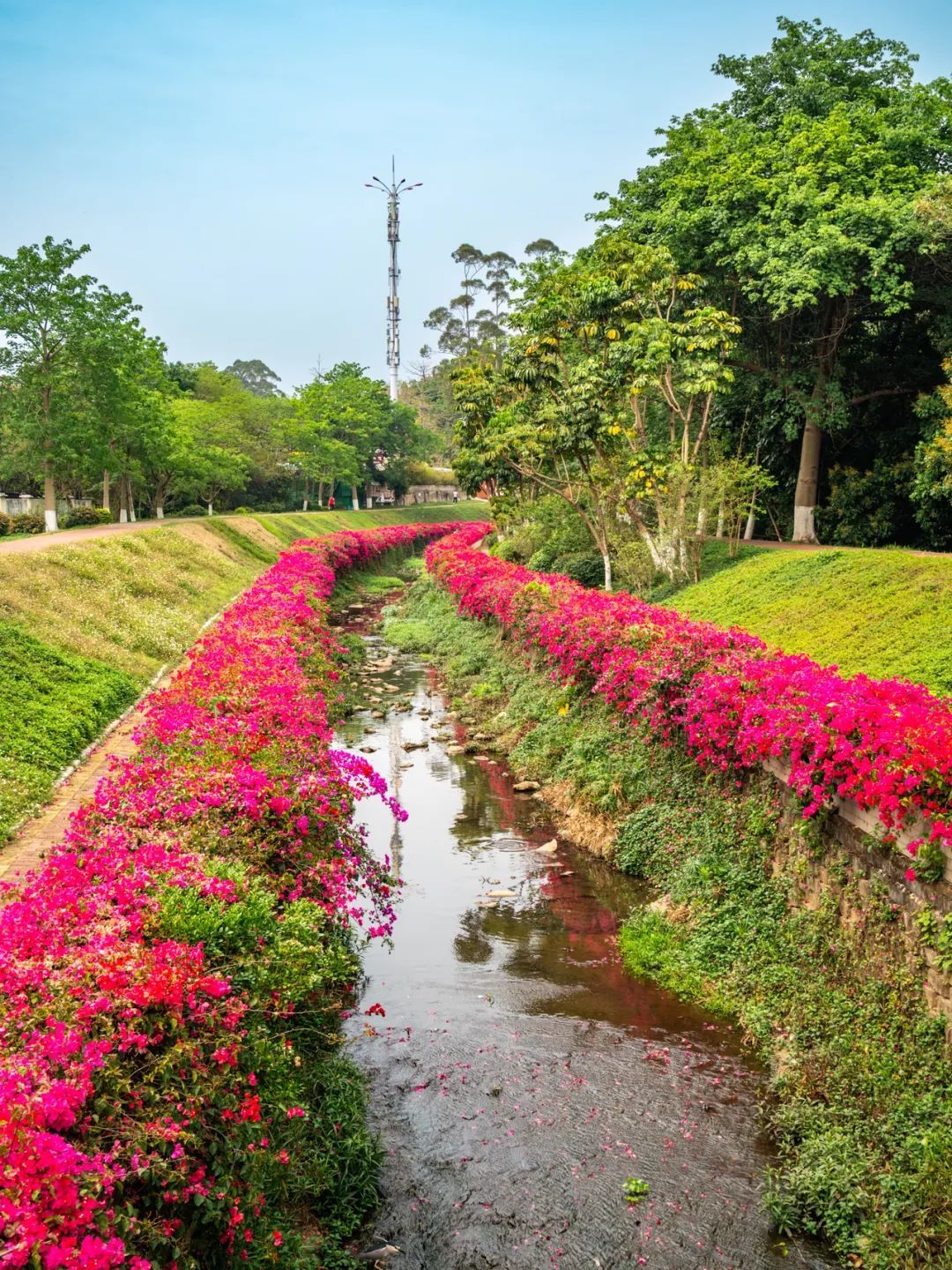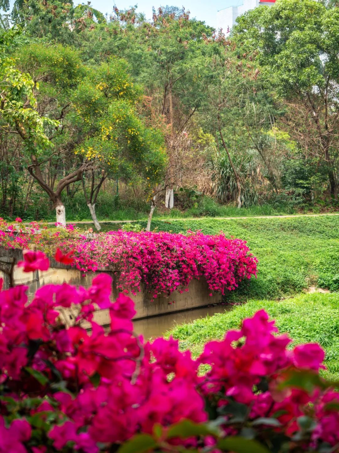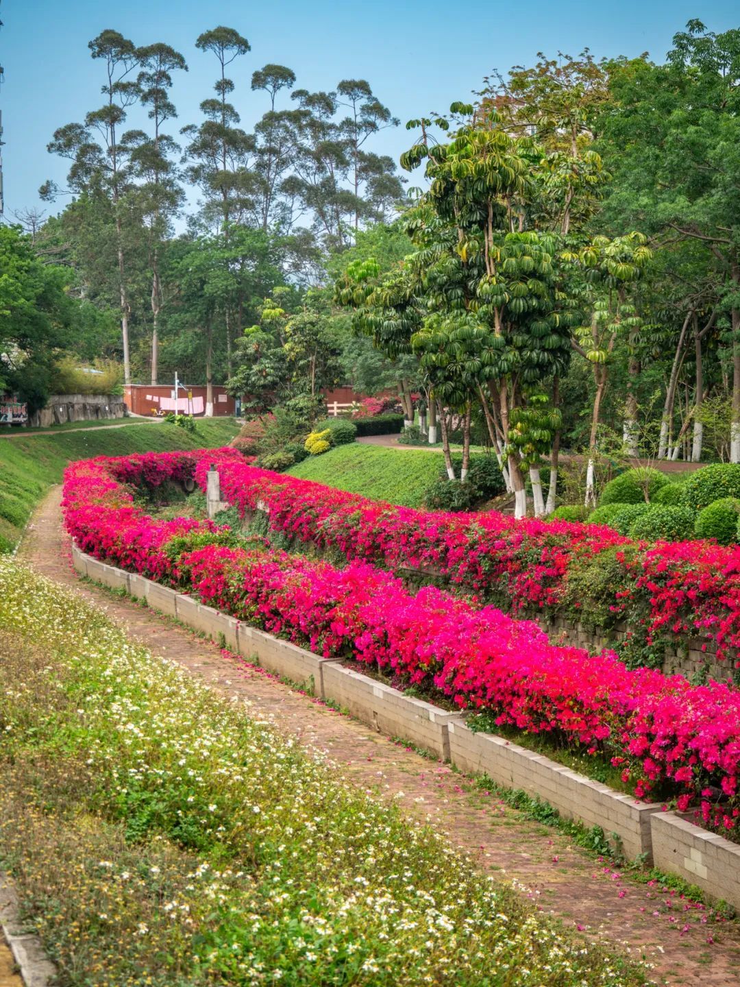只见色调以粉、紫、红为主的簕杜鹃如瀑布般垂落,“花瀑”蜿蜒数百米,岸边是步道,高大苍翠的乔木将步道荫蔽。