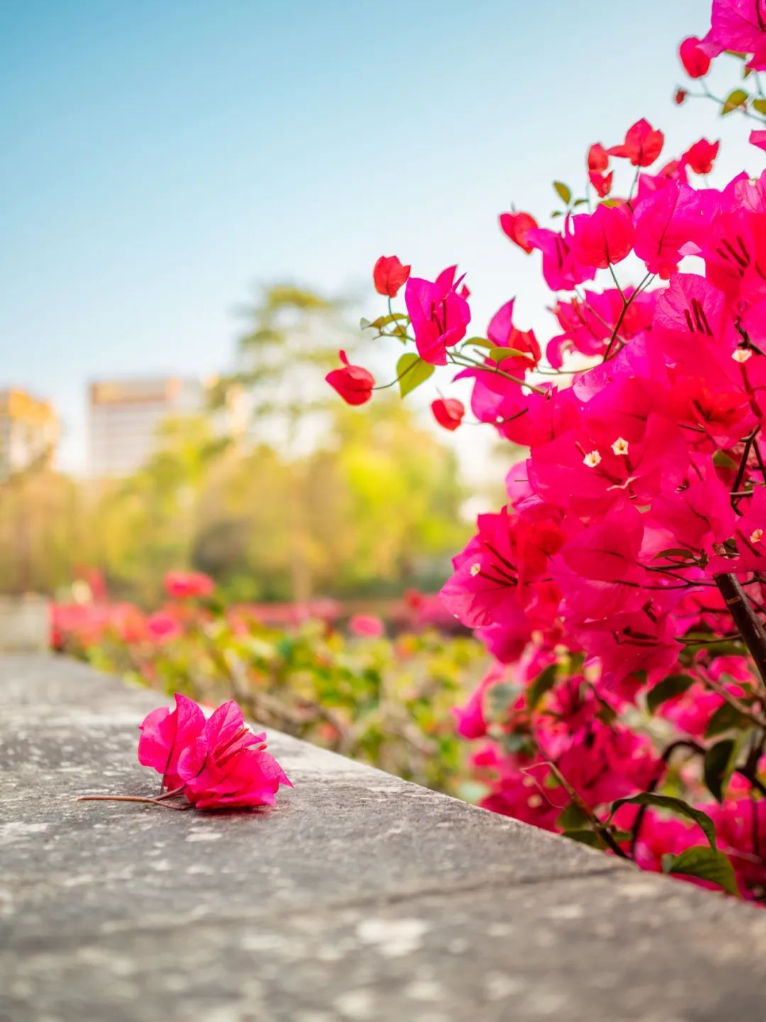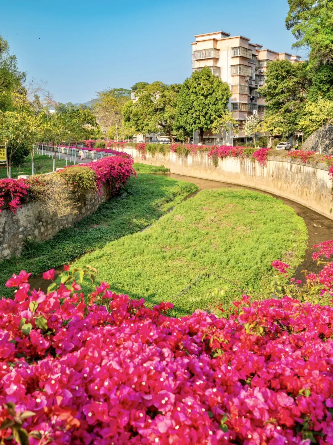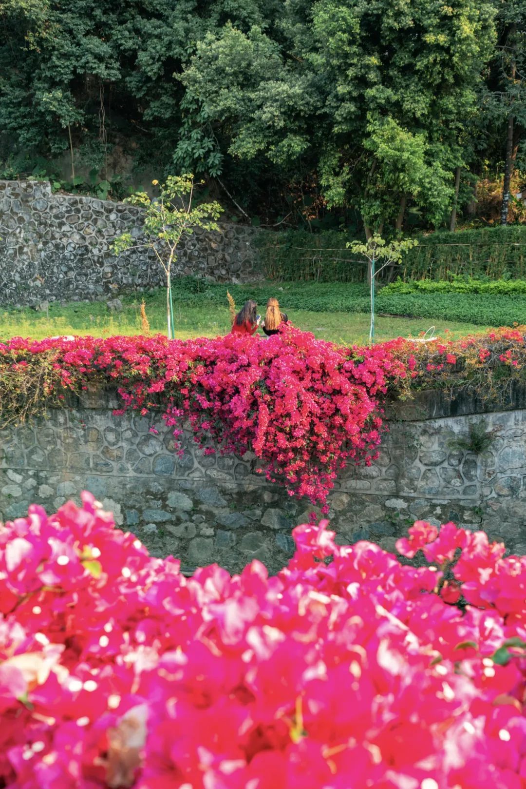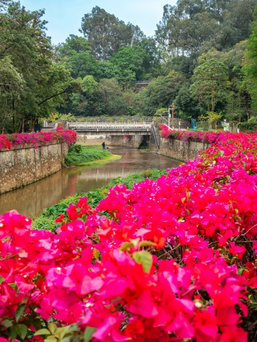 只见色调以粉、紫、红为主的簕杜鹃如瀑布般垂落,“花瀑”蜿蜒数百米,岸边是步道,高大苍翠的乔木将步道荫蔽。