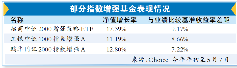 Choice数据显示,目前市场上近700只指数增强型基金,今年以来(截至5月7日),在有数据统计的基金中,超七成跑赢跟踪的标的指数。其中,招商中证2000增强策略ETF、工银中证1000指数增强等多只基金,实现超额收益超5%。