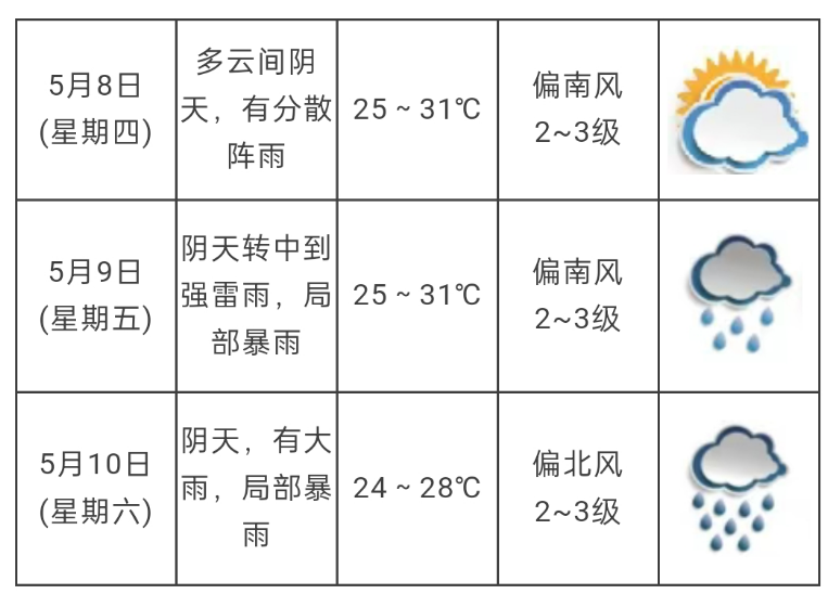 据南沙区气象台消息:预计5月9—10日南沙区有中到强雷雨局部暴雨,并伴有明显强对流过程。主要影响时段为:5月9日午后至10日白天。过程累积雨量40—80毫米,局部80—120毫米,最大小时雨强40—60毫米;伴有8—9级局部10级阵风和雷电。11日起降水减弱。