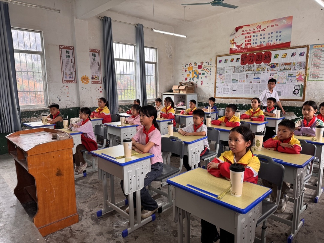 这次,古茗带来了20张崭新的不锈钢六人餐桌,不锈钢的材质可以确保使用年限,六人桌也能让排队领餐的孩子们基本满足同时进餐。除了餐桌外,古茗也替孩子们换掉了老课桌椅,同时也新增了两台可视化设备,提升了他们的教学环境。