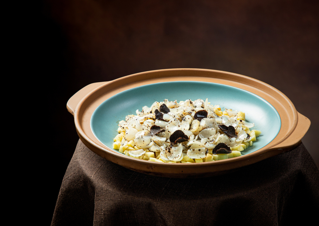 师傅传承经典家常做法,杜阮凉瓜斜切薄片,透光见青绿经络,搭配新鲜鹅肠翻炒,杜阮凉瓜微苦回甘与爽脆鹅肠的咸鲜共舞,尽显浓浓岭南味;而那砂锅黑松露焗九年百合,更是把清雅的百合吃出花来,店家甄选九龄深山百合,三年生三年长三年养,每一瓣都历经72季风雨洗礼,剥开瓣肉如玉,入口如嚼山间清露。师傅精选九年百合,融入黑松露的馥郁,佐以少许姜蒜焗制,咬上一口,百合的软糯与清甜瞬间在口中散开。