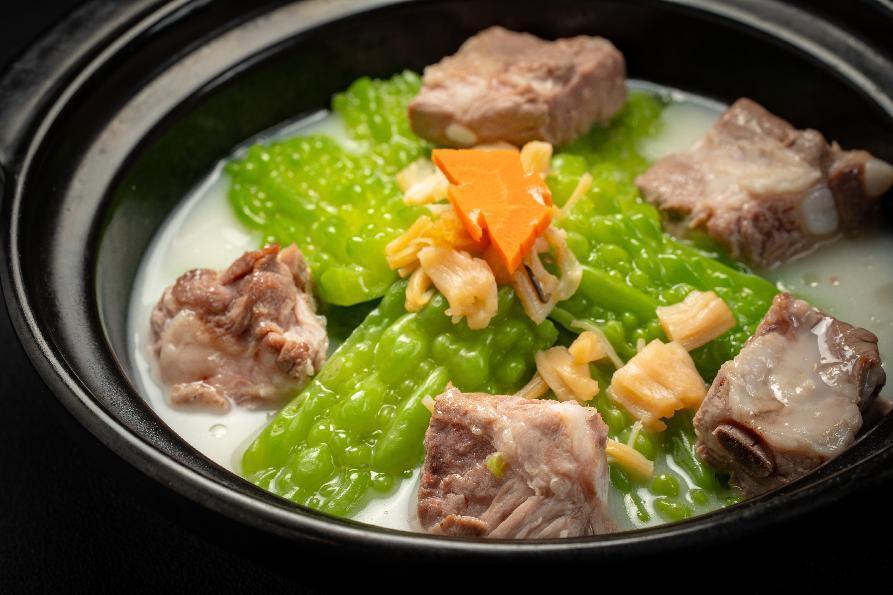 珍珠瓜是另一岭南特色瓜果,盛产于潮汕地区。珍珠瓜是苦瓜变种,因表面珠粒状凸起得名“酪酥瓜”,传统菜肴“潮式煲淋珍珠瓜”体现的是“粗料精作”理念,以家常食材通过慢火煲煮呈现出宴席级风味,店内这次也奉上。珍珠瓜软糯带脆,排骨酥烂脱骨,黄豆绵密化沙,汤汁浓稠挂舌。从味道层次来看,苦甘交融:珍珠瓜初尝微苦,后调清甜;海陆鲜香突出咸菜的酸爽、黄豆的醇厚与排骨油脂融合,普宁豆酱的发酵酱香点睛。据店家介绍,普宁豆酱源自明代潮汕移民对中原酱文化的改良,陶缸古法发酵6-12个月。