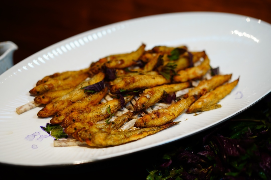 初夏时,正是紫苏上市最佳时节。纤细的枝干,紫、绿双面色的紫苏叶,微淡的薄荷味与药香,成为了从化当地极爱的一种自然的调味食材。山坑鱼是从化的特色河鲜,油炸的烹饪手法,口感喜人,外酥里嫩。于是,天人山水的马师傅以酥炸的芋丝作垫,紫苏佐味,如此搭配,山坑鱼风味更佳。