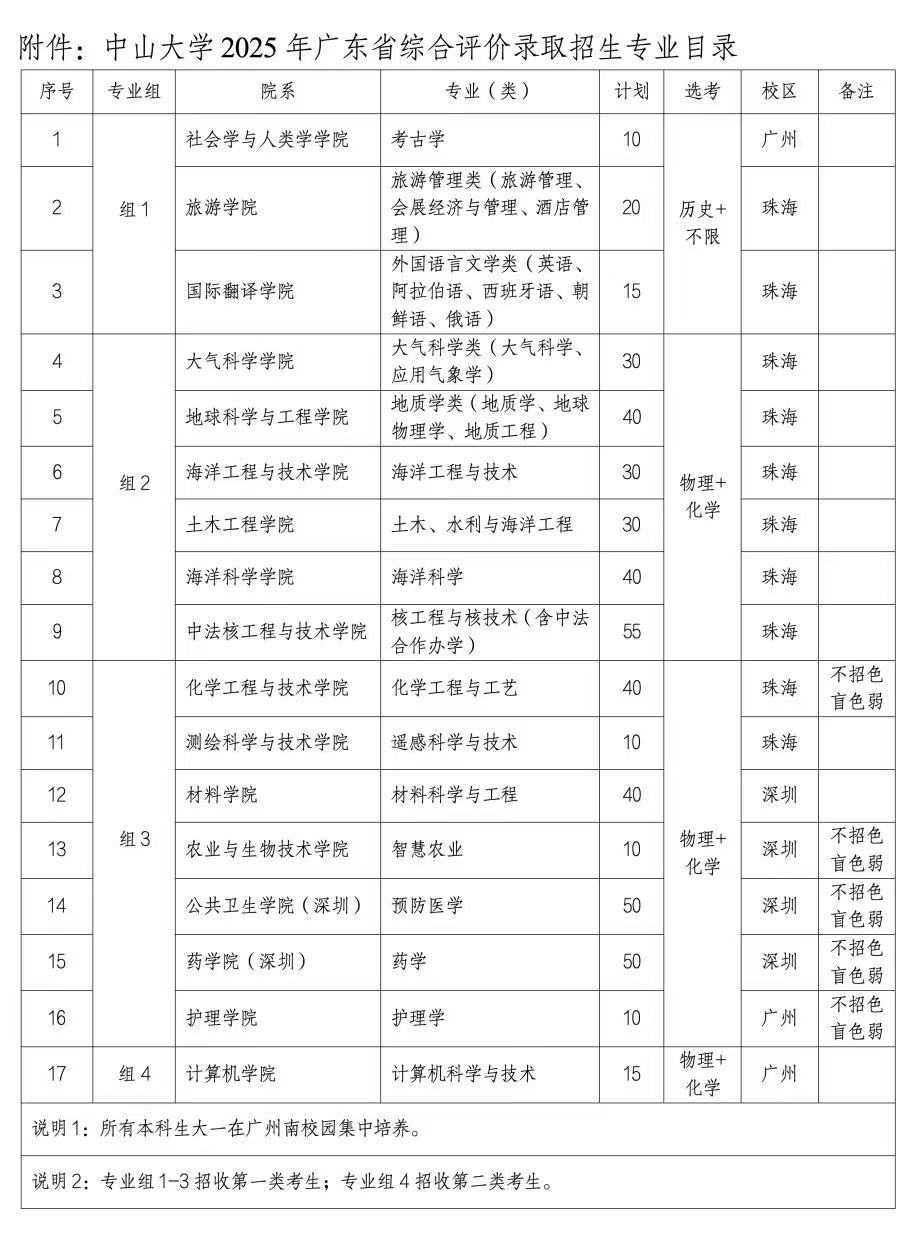 中山大学2025年广东省综合评价录取招生专业目录