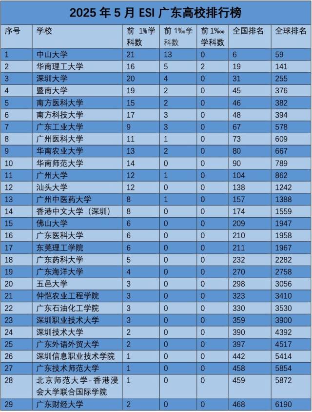 近日,科睿唯安公布了ESI(Essential Science Indicators,基本科学指标)从2015年1月到2025年2月的统计数据:广东高校保持良好态势,稳步前进,其中10所高校稳居全国百强;中山大学首次入列全球前60位;6所高校新增9个全球前1%、1‰和1‱学科。