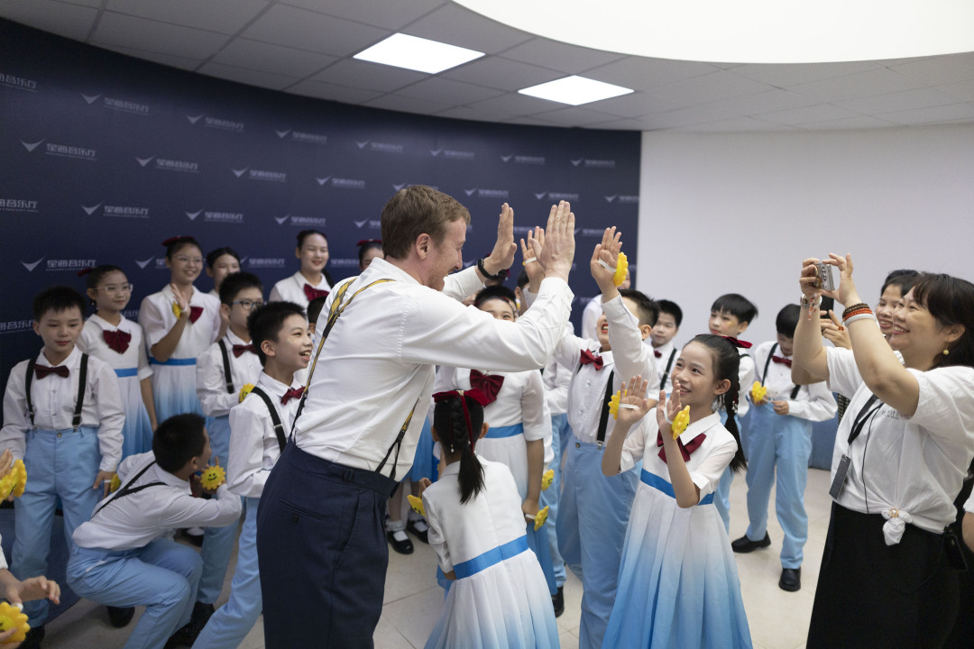 演出前,国王歌手合唱团的歌手们和东风村第二小学的孩子们击掌。