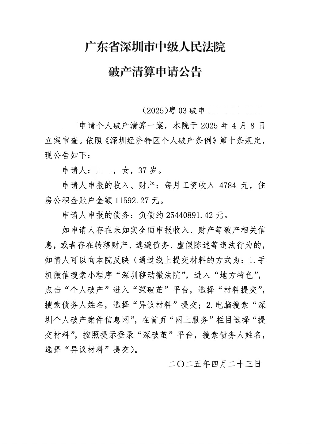 5月10日,记者登陆深圳深圳市中级人民法院查阅到了该公告,女子申报的收入和财产仅包括每月工资收入4784元,住房公积金账户金额11592.27元,并无其他存款、房产、汽车、股票等财产申报。对于女子申请个人破产清算一案,公告称深圳市人民法院于2025年4月8日立案审查。如申请人存在未如实全面申报收入、财产等破产相关信息,或者存在转移财产、逃避债务、虚假陈述等违法行为的,知情人可以向法院反映。