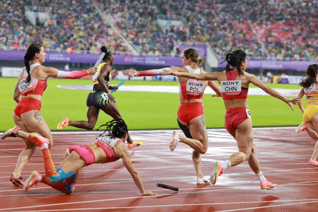 比赛中有欢乐,也有遗憾。在今晚进行的世界田联接力赛女子4x100米接力项目中,广东选手梁小静在和队友葛曼棋交接棒时不慎摔倒,未能成功交接——由陈妤颉、李玉婷、梁小静、葛曼棋组成的中国队以1分12秒82小组垫底,无缘决赛,未能直通东京世锦赛。