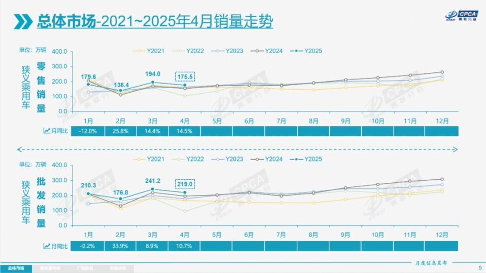 【4月乘用车零售同比增长14.5%,新能源渗透率51.5%】5月11日,全国乘联分会发布2025年4月份全国乘用车市场分析。数据显示,4月全国乘用车市场零售175.5万辆,同比增长14.5%,环比下降9.4%。今年以来累计零售687.2万辆,同比增长7.9%。查看详情>>
