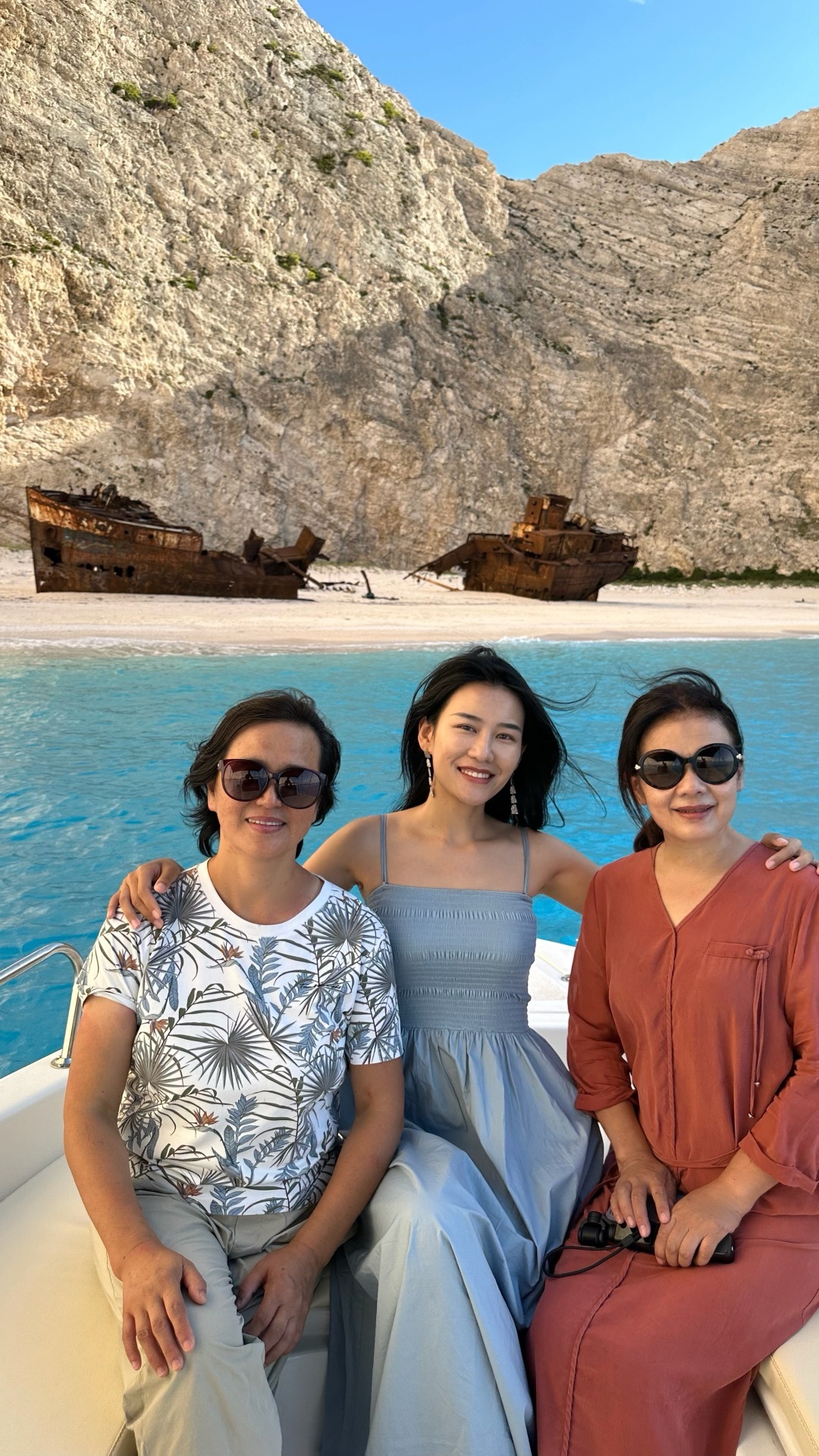 龚女士与两位妈妈在希腊扎金索斯沉船湾合影
