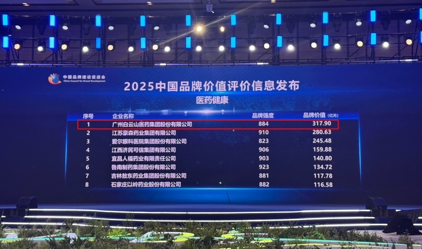 2025世界品牌莫干山大会日前举行。作为大会的重要环节之一,由中国品牌建设促进会、中国资产评估协会主办的“2025中国品牌价值评价信息”于5月10日发布。在此次发布中,广州白云山医药集团股份有限公司(以下简称“广药白云山”)以317.90亿元品牌价值,名列医药健康领域第一。