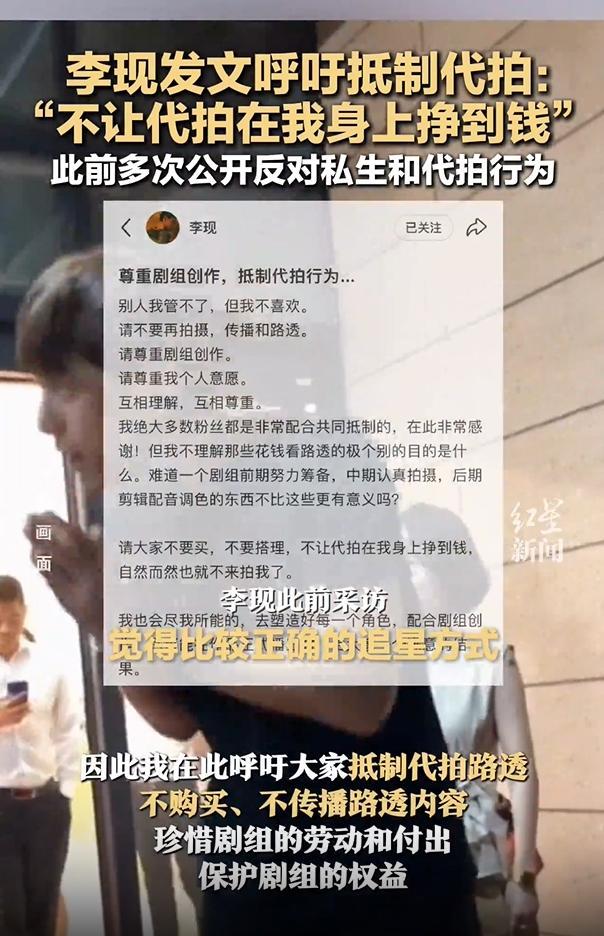 其实,近年来,吴京、胡歌、王俊凯等多名艺人都曾在公开场合怒斥代拍行径。此番李现的呼吁中,还以接地气的劝说言辞引发关注,“难道一个剧组前期努力筹备,中期认真拍摄,后期剪辑配音调色的东西不比这些更有意义吗?请大家不要买,不要搭理,不让代拍在我身上挣到钱,自然而然也就不来拍我了”。