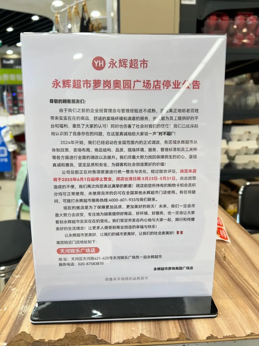 近日,永辉超市萝岗奥园广场店发布停业公告,公告称由于经营理念与管理经验不成熟,未能真正给老百姓带来实实在在的商品、舒适的卖场环境和满意的服务,向消费者及员工致歉。