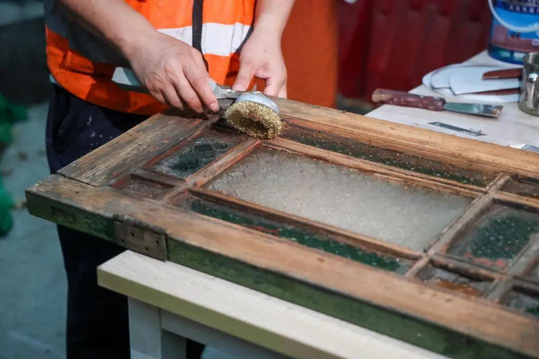 针对广式花窗的修复,施工方制定了严格的工艺标准。例如在保护性拆除木窗时,老化的螺丝需先用麻花钻头磨平螺帽,再拆除木窗,确保木窗完整性。对于破损但可修复的木窗页,其老化破损的海棠花玻璃及夹线条,采用其它无法修复的广式花窗对应部位海棠花玻璃及夹线条,翻新处理后安装至本窗页。除漆应先用铲刀对木窗页油漆轻铲使其表面油漆杂物硬块等脱落,再使用砂纸打磨并清理表面,最后使用脱漆剂清洗表面,将木窗页表面油漆清除干净等。
