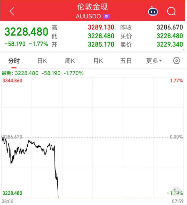 刚刚,金价突然跳水。伦敦金指数直线下挫,截至今天下午15:28,伦敦金现跌破了3230点。