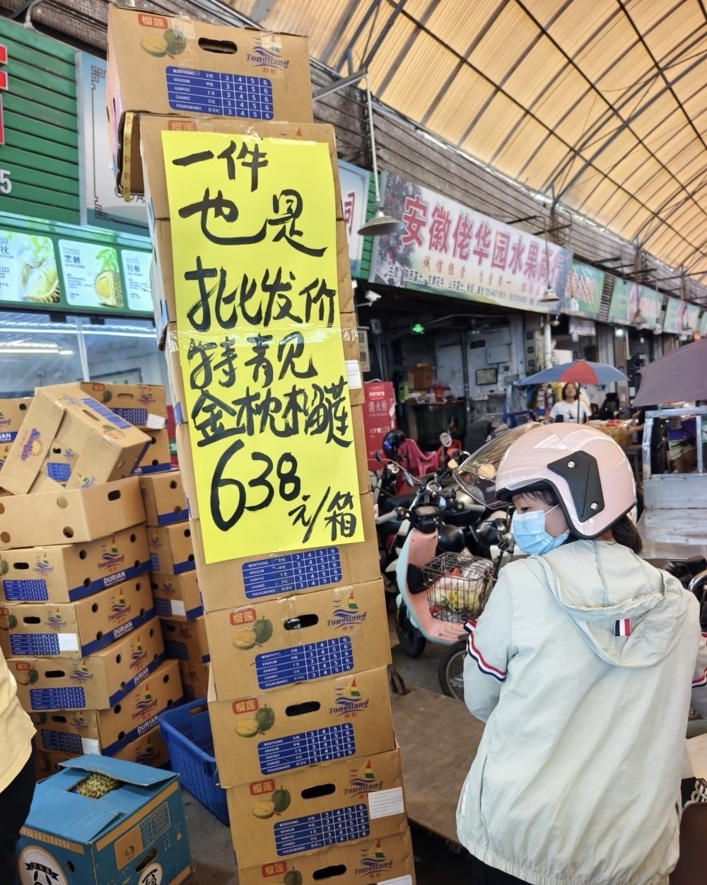 5月11日下午4时许,记者走进番禺区最大的综合批发市场——清河综合市场,只见水果区内七八家档口都将榴莲摆放在最显眼的位置,宛如一座座小山般堆积。特价牌上写着15元/斤、18元/斤、19.8元/斤、26元/斤等诱人的价格,吸引着众多市民前来购买。每个档口前都人头攒动,热闹非凡。