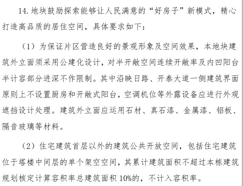 5月挂牌的黄埔区映日路以北、开泰大道以东地块显然已经开始落地住宅设计新规。地块的规划条件在建筑控高中特别标注了“限高150米(按照出让成交时点的国家规范执行)”。并且明确地块鼓励探索能够让人民满意的“好房子”新模式,精心打造高品质的居住空间,要求地块建筑外立面须采用公建化设计,对半开敞空间连续开敞率及内凹阳台半计容部分进深不作限制。其中沿映日路、开泰大道一侧建筑界面原则上不设置厨房和开敞式阳台,空调机位等外露设备应进行外观遮挡设计处理。建筑外立面应运用石材、真石漆、金属漆、铝板、 隔音玻璃等材料。住宅建筑首层以外的建筑公共开放空间,包括住宅建筑位于塔楼中间层的单个架空空间,其累计建筑面积不超过本栋建筑规划核定计算容积率总建筑面积10%的,不计入容积率。