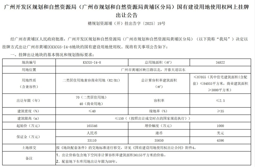 根据出让公告,地块位于黄埔区映日路以北,开泰大道以东,出让面积34822㎡,容积率2.5,建筑面积87055㎡,其中住宅建筑面积(含配套)≤84055㎡,商业建筑面积≥3000㎡。