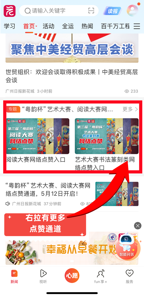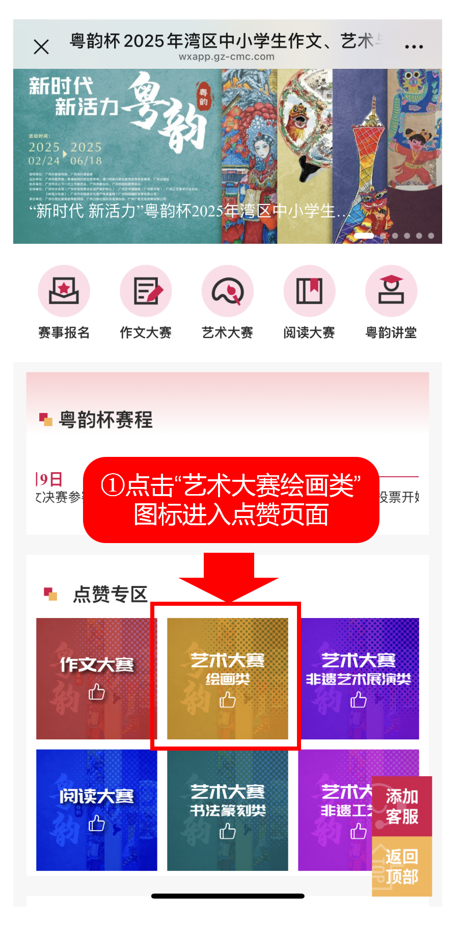 在首页下拉,找到“粤韵杯”艺术大赛、阅读大赛网络点赞入口,选择你需要点赞的入口,点击进入即可: