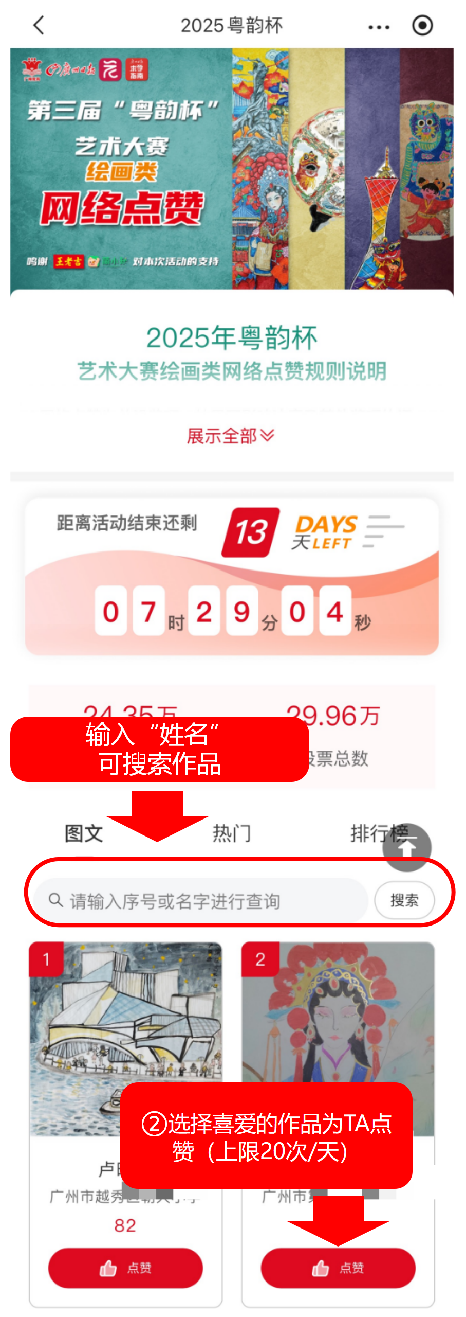 在搜索栏输入参赛者姓名,可查找到作品,按点赞按钮,为心仪作品点赞