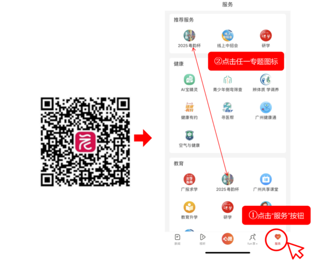 App端入口:扫描以下二维码,下载“广州日报新花城”客户端,点击客户端底部“服务”按钮,选择“2025粤韵杯”图标进入专题。