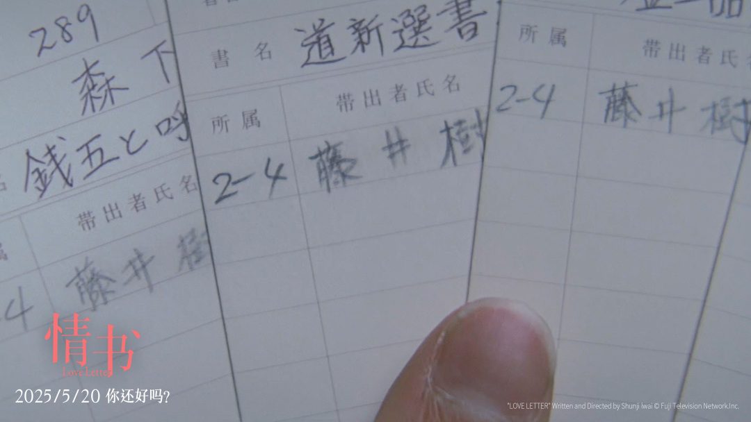 电影《情书》由岩井俊二编剧、执导,中山美穗、丰川悦司、酒井美纪、柏原崇主演,讲述了渡边博子(中山美穗 饰)给去世的前未婚夫藤井树寄出一封本该没有回应的书信,却意外收到一位署名为“藤井树”的女孩(中山美穗 饰)回信;在二人的书信往来中,女孩藤井树逐渐发现,与她同名同姓的少年藤井树(柏原崇 饰)曾对自己暗藏一腔柔情,而渡边博子也在过程中与过往感情和解告别的故事。