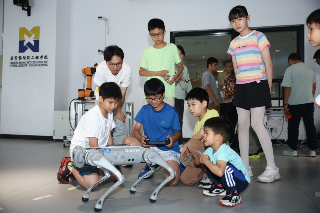 比赛当日适逢吴贤铭智能工程学院开放日,百余位中小学生与家长参加活动。大家不仅在大屏幕上的比赛中感受代码的魅力,还在专题讲座中了解具身智能前沿应用,更来到学院实验室,近距离观看、触碰没有鱼鳃却可以在海里游动的机器鱼,没有心脏也可以快速奔跑的机器狗,没有羽毛还可以在空中翱翔的机器鸟,仿佛置身“赛博动物园”的机器世界。