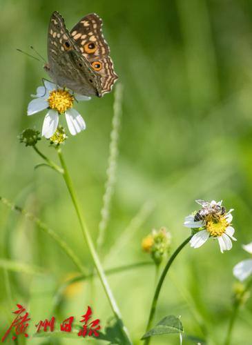 阳光下的绿地中,蜜蜂和蝴蝶“同框”采蜜。