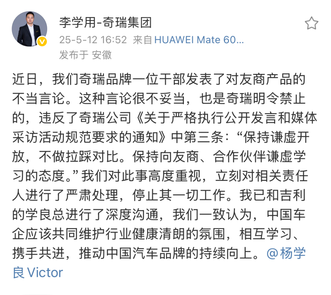 5月12日,奇瑞汽车股份有限公司执行副总裁李学用公开表示,近日,奇瑞品牌一位干部发表了对友商产品的不当言论。这种言论很不妥当,也是奇瑞明令禁止的,违反了奇瑞公司《关于严格执行公开发言和媒体采访活动规范要求的通知》中第三条:“保持谦虚开放,不做拉踩对比。保持向友商、合作伙伴谦虚学习的态度。”奇瑞对此事高度重视,立刻对相关责任人进行了严肃处理,停止其一切工作。