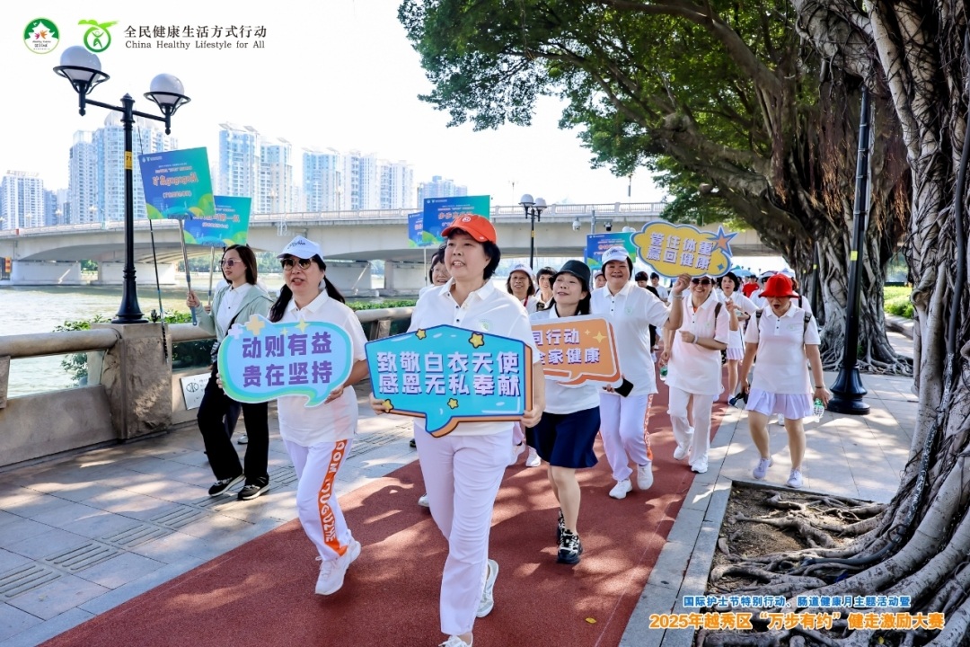 活动现场,各位嘉宾共同上台,正式启动2025年全国第十届“万步有约”健走激励大赛越秀赛区活动。随后,专业健身教练带领全体参赛人员进行了热身运动,并示范了科学健走的正确姿势。由护士方队列队打头阵,开启珠江边步道路径进行健步走,以体育公园为起点,经过绿道缓跑径,到达海心桥脚,以一场别开生面的健步走活动向护士们致以最崇高的敬意。