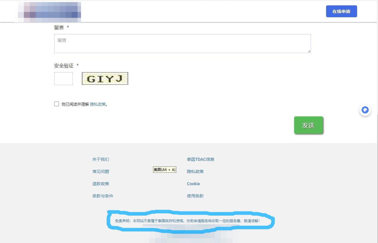 ▲需要付费的泰国入境卡申请网站的“免责声明”(框内)