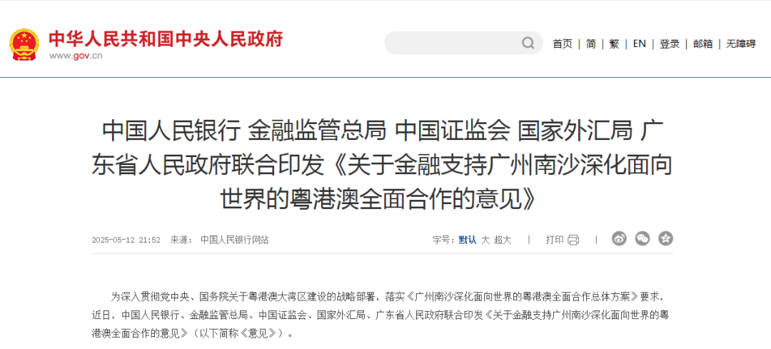 5月12日,中国人民银行、金融监管总局、中国证监会、国家外汇局、广东省人民政府联合印发《关于金融支持广州南沙深化面向世界的粤港澳全面合作的意见》(以下简称“南沙金融30条”)。
