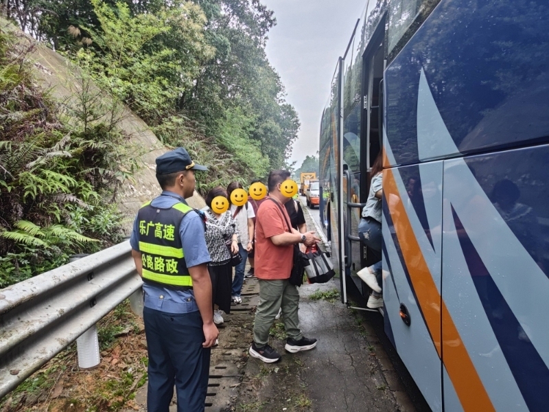路政员到达现场后发现,一辆粤S牌大巴车亮起双闪警示灯停在应急车道,多名乘客在应急车道走动。路政员随即开启路政车载警报器,提醒后方来车控制车速、谨慎驾驶,做好安全围蔽措施、警戒,并耐心安抚司乘人员情绪,引导大家转移至护栏外的安全区域等待救援。