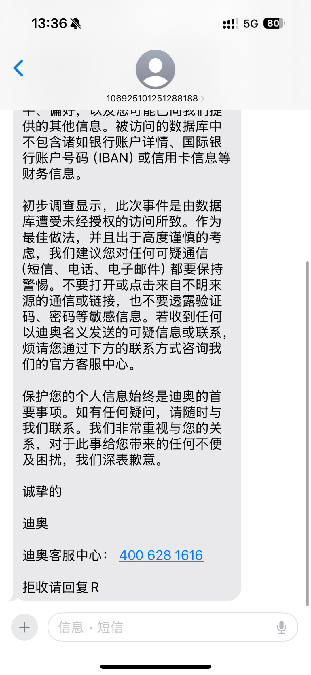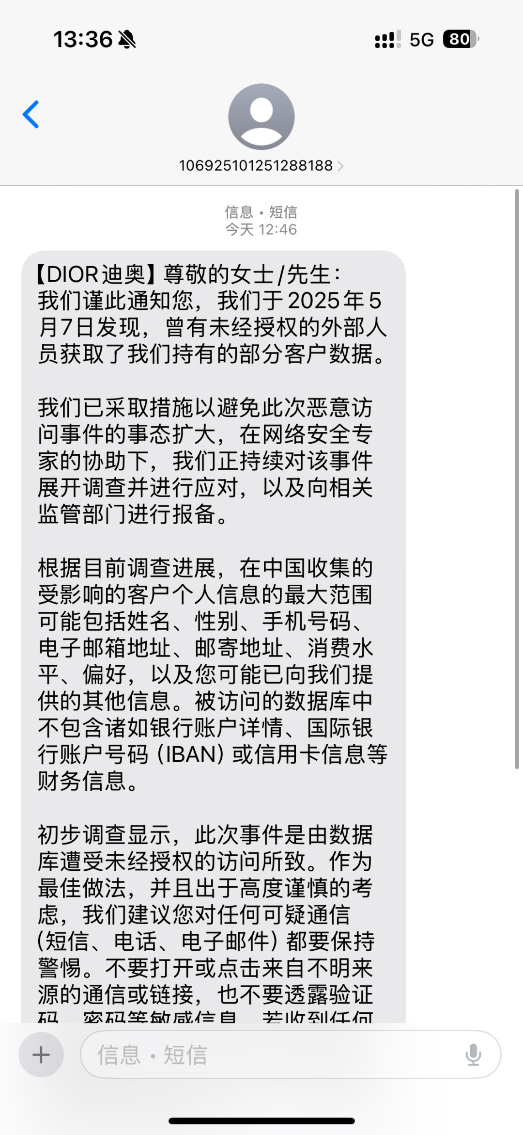 5月13日,有读者向记者报料,称收到迪奥官方向用户发送的短信通知。短信内容指出,该品牌在5月7日发现,一名未经授权的外部人士访问了其数据库,获取了部分客户的敏感信息。此次泄露涉及的数据包括:客户姓名、性别、手机号、电子邮箱、邮寄地址、消费金额、消费偏好及其他用户信息。