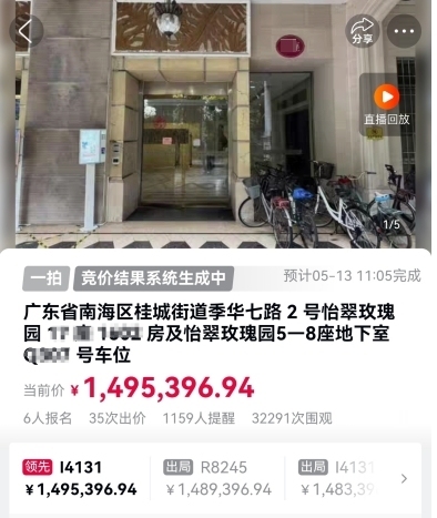 阿里法拍平台显示,该法拍房位于佛山怡翠玫瑰园,建筑面积:150.24 ㎡,一同拍卖的还有该小区一处地下车位。房产原定拍卖时间为5月12日10时至5月13日10时,起拍价为1291396.94元(参考价70%),每次加价幅度为6000元。参与兑拍的买家需要交纳25万元保证金。
