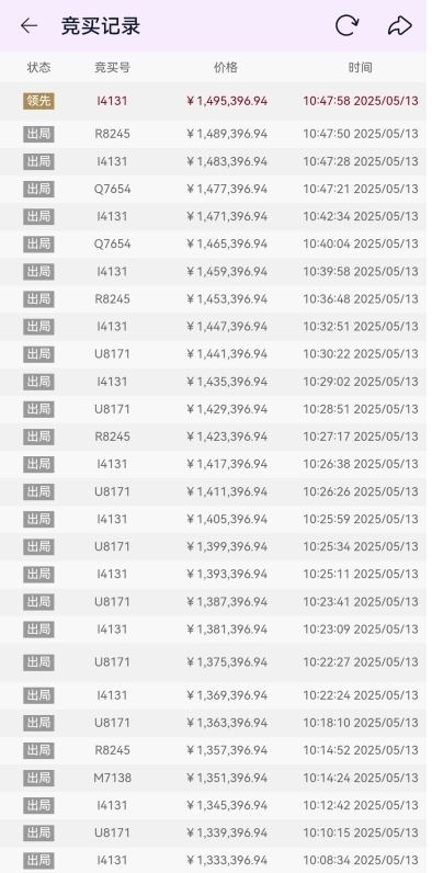 直到10时47分,买家I4131将最终拍卖价格定格在1495396.94元后,再无买家出价。最终,经历了35次出价,33次延时后,以溢价20.4万元的结果成交。值得注意的是,买家I4131先后出价16次,可谓“志在必得”。