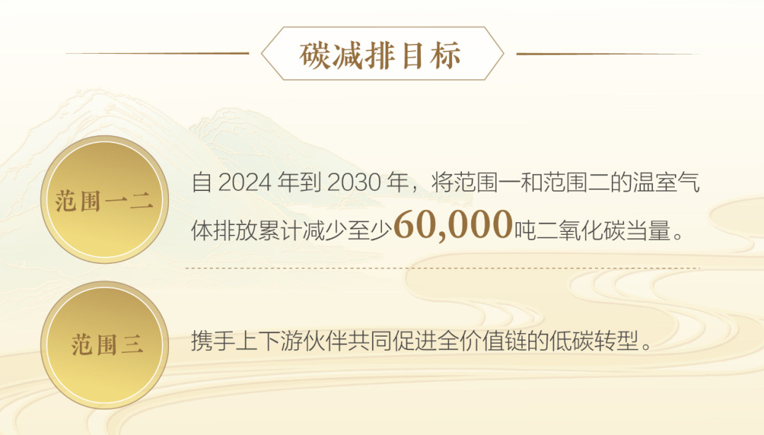 在全球应对气候变化的背景下,水井坊率先迈出关键一步——首次完成覆盖范围一、范围二及范围三的全价值链温室气体盘查,并发布面向2030年的碳减排目标。根据报告,水井坊计划自2024年至2030年,累计减少范围一(直接排放)和范围二(间接排放)温室气体至少6万吨二氧化碳当量;同时,通过深化与上下游伙伴合作,推动范围三(价值链相关排放)的全面低碳转型。这一目标的制定不仅契合国际气候行动趋势,更标志着水井坊将减排责任从自身运营延伸至全产业链。
